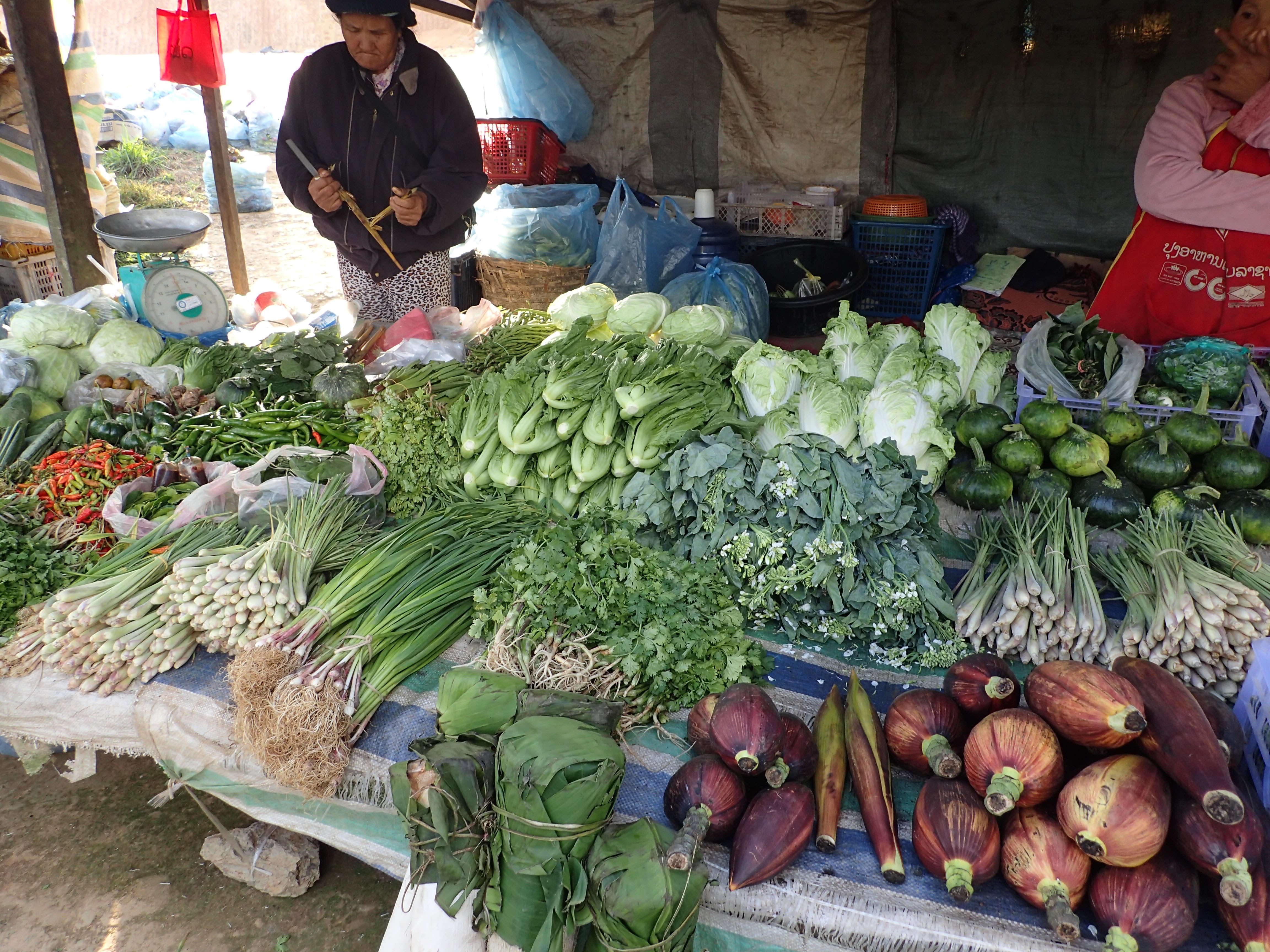 OLYMPUS DIGITAL CAMERA Published January 21, 2016 at 4608 × 3456 in Plain of Jars to Phou Khoun. 21st Jan. Banana flowers and banana tree trunks. And other more recognisable stuff.