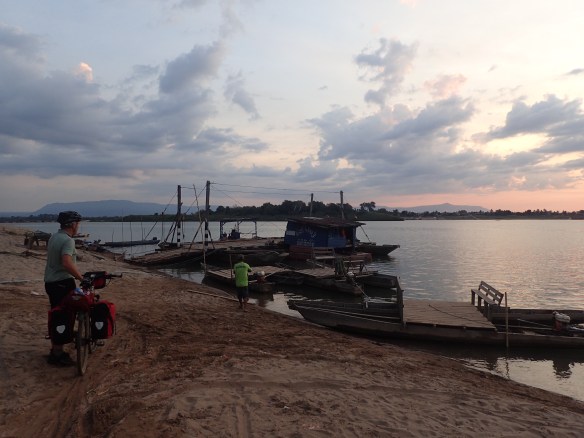 Almost thwarted by not finding any ferryman to take us across the Mekong to Don Khong island, when miraculously he appeared. The financial negotiations kept changing but finally paid 40 kip (about £4) for 2 people and 2 bikes on his long tail boat. Worth it, as the alternative is a 15km detour and a new bridge. After 110km we thought another 15km was just a tad too much.